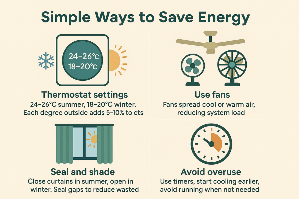 • Thermostat settings: In summer, set between 24 and 26 degrees. In winter, aim for 18 to 20 degrees. Each degree beyond this range can add 5 to 10 per cent to running costs.